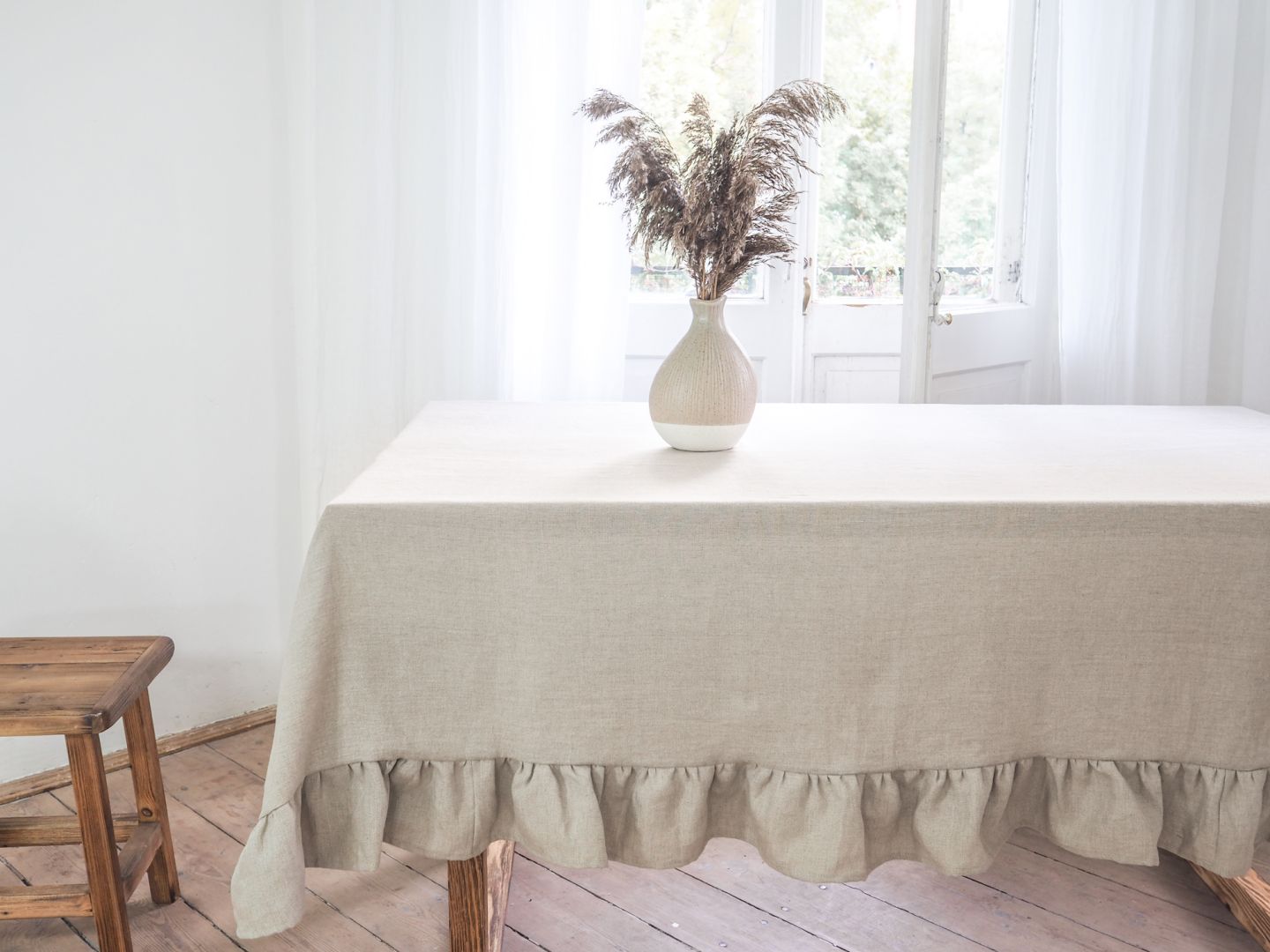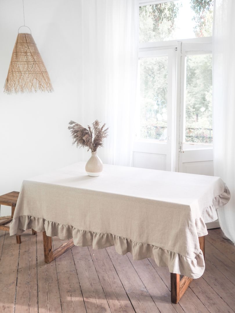 Ağır keten kumaştan yapılmış fırfırlı keten masa örtüsü . %100 ketenin yüksek ağırlığı, masa örtülerini son derece sağlam hale getirir. Böylece sadece yılbaşı sofra süslemelerinde kendilerini kanıtlamakla kalmayacaklar, her gün başarıyla kullanılabilirler ve uzun yıllar ketenin dayanıklılığının tadını çıkarırlar. Fırfır 13 cm uzunluğunda olup masa örtüsünün ölçüsüne dahildir . Doğal renkli keten boyalı değildir. Renk tonu, çiçeklerin büyüdüğü koşullara bağlıdır, bu nedenle renk tonlarında biraz farklılık gösterebilir.