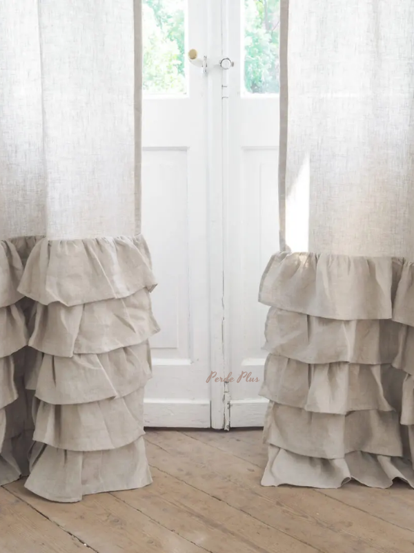Doğal renkteki keten perdeler, içeriye giren güneş ışınlarını yumuşatır. Keten kumaşın benzersiz dokusu, serbest hava sirkülasyonu sağlar. Perdelerde beş sıra dekoratif fırfır bulunur.